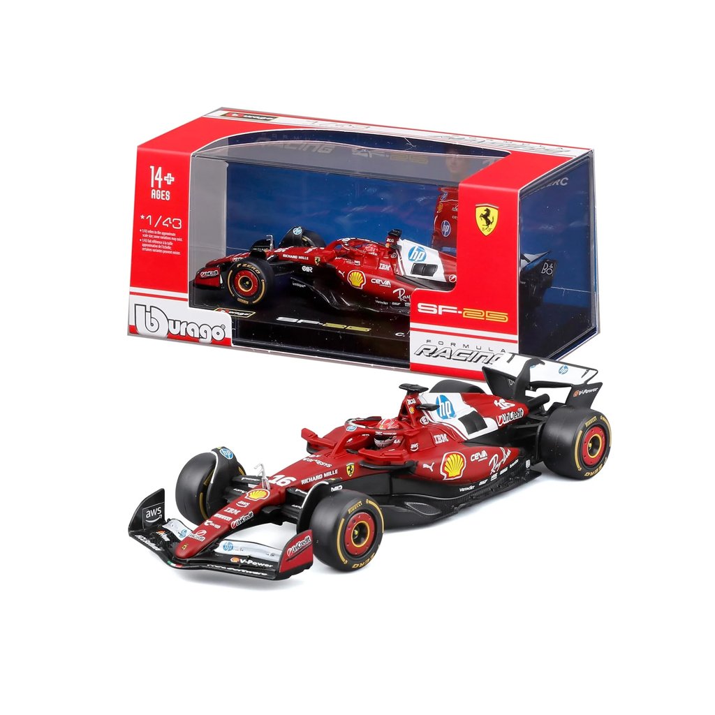 Sběratelský model monopostu Ferrari SF-25 v barvách týmu Scuderia Ferrari pro sezónu 2025. Model zachycuje vůz Charlese Leclerca (#16) z nové éry Formule 1 a vyniká detailním zpracováním typickým pro sérii BBurago Signature.